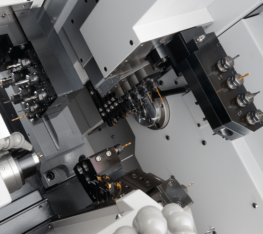 · 有了(le)2根主軸3個刀架(jia)的結構,實現了(le)優質的同步加(jiā)工功能
